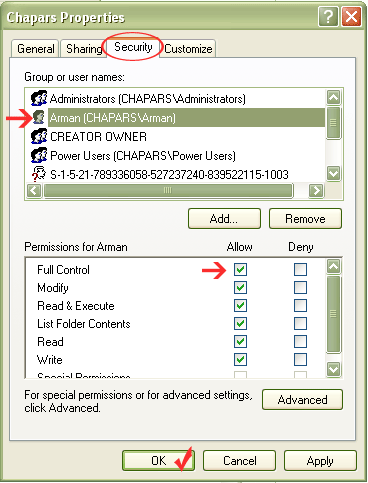 انتخاب و سپس ویژگی Full Control آنرا