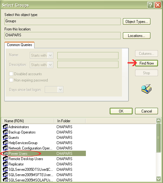 Find Now را انتخاب می کنیم تا لیست کاربران و گروه های کاربری